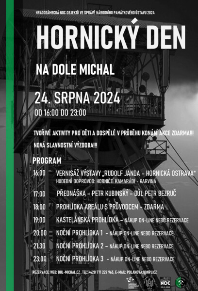 Na Kastelánskou prohlídku a Noční prohlídky je nutný nákup vstupenky on-line, případně rezervace (kastelánskou prohlídku můžete zakoupit on-line označenou jako Cesta havíře do práce a zázemí 24. 8. v 19 hodin).