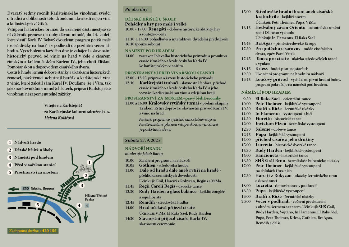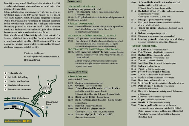 O víkendu 27. a 28. září 2025 se již po sedmadvacáté v podhradí Karlštejna i na hradním nádvoří na dva dny rozezvučí pištci, trubači a hudebníci, rozjedou se rytířská klání, roztančí se tanečnice a bude se slavit vinobraní. Ani letos si slavnost nenechá ujít sám císař Karel IV., který by letos oslavil své 709. narozeniny. Doprovázet jej bude jak jeho choť císařovna Eliška Pomořanská, tak více jak 150 dvořanů z Karlova dvora.